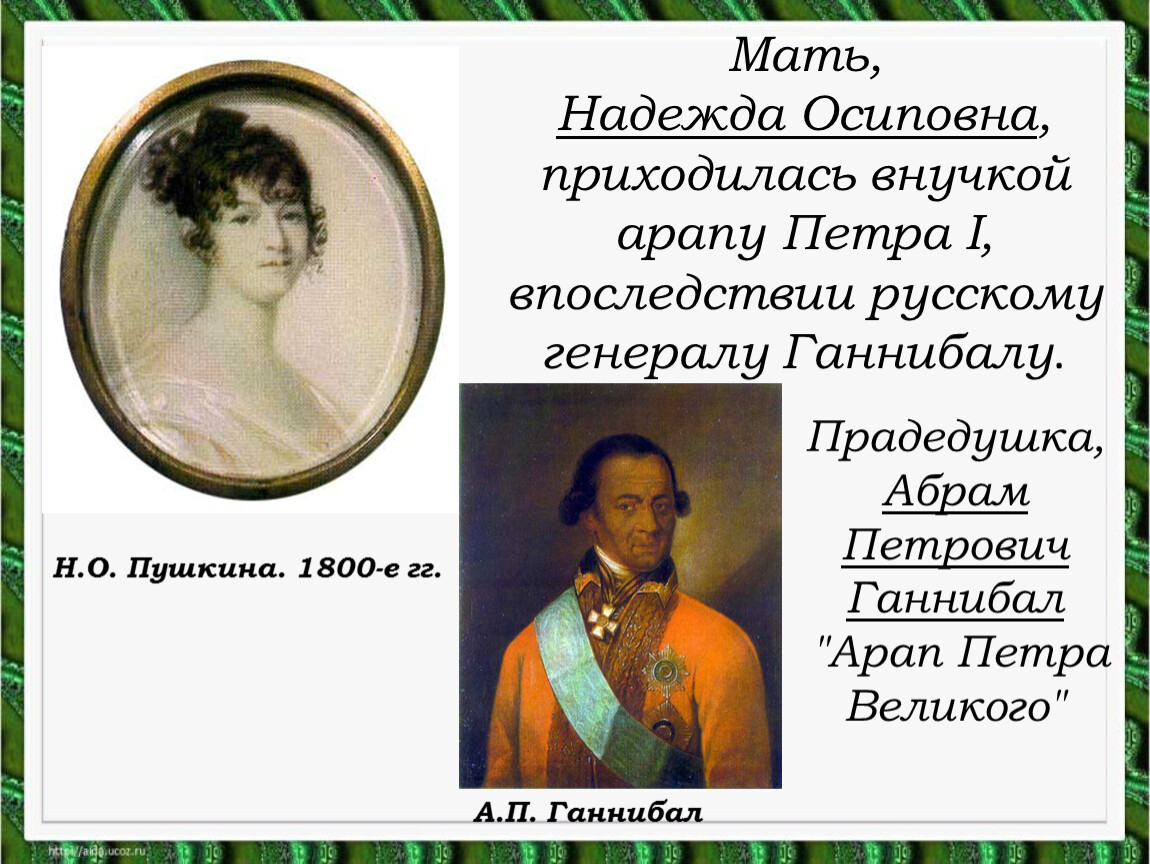 Надежда Осиповна, приходилась внучкой арапу Петра I, впоследствии русскому генералу Ганнибалу.