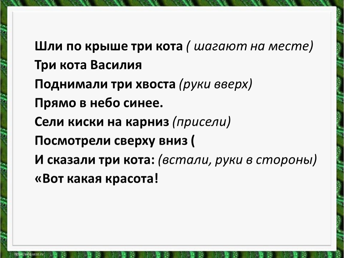 Шли по крыше три кота ( шагают на месте)