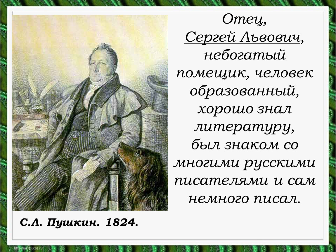 Сергей Львович, небогатый помещик, человек образованный, хорошо знал литературу,