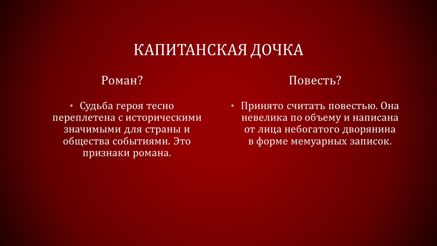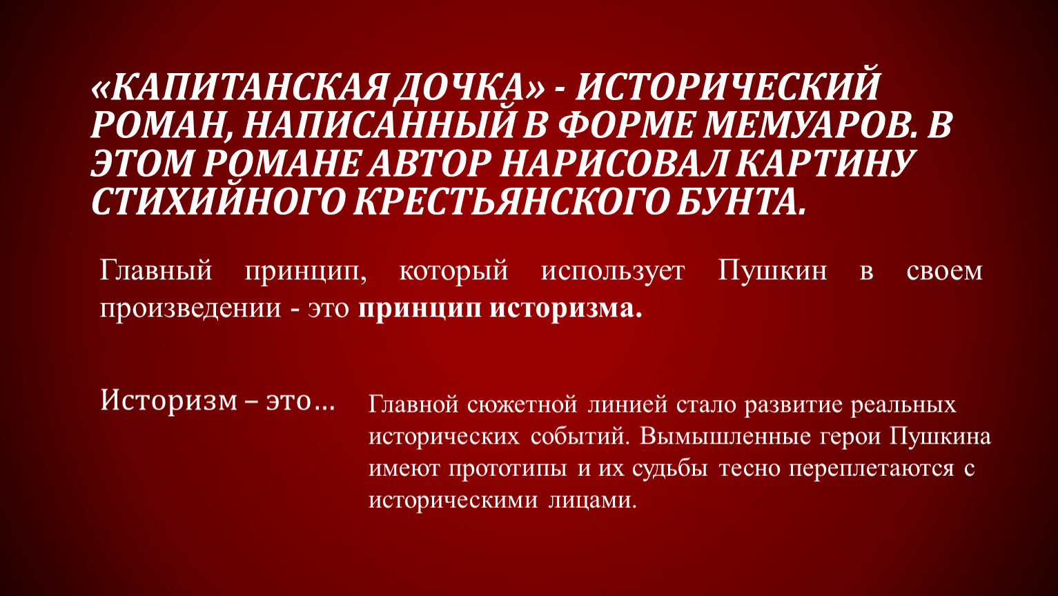 «Капитанская дочка» - исторический роман, написанный в форме мемуаров. В этом романе автор нарисовал картину стихийного крестьянского бунта.