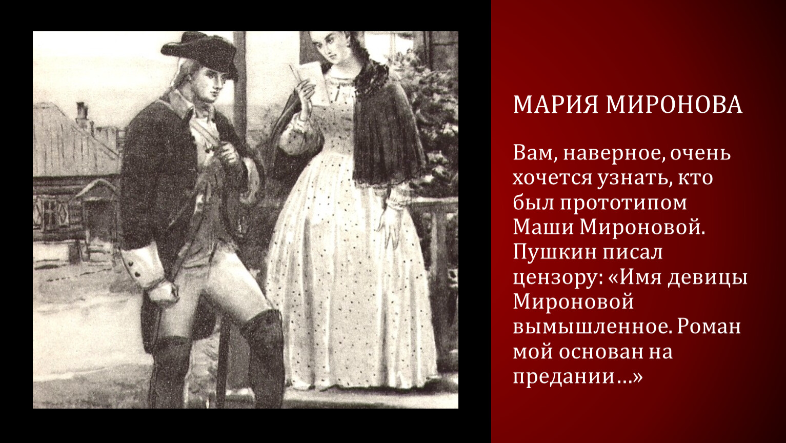 Вам, наверное, очень хочется узнать, кто был прототипом Маши Мироновой. Пушкин писал цензору: «Имя девицы Мироновой вымышленное. Роман мой основан на предании…»