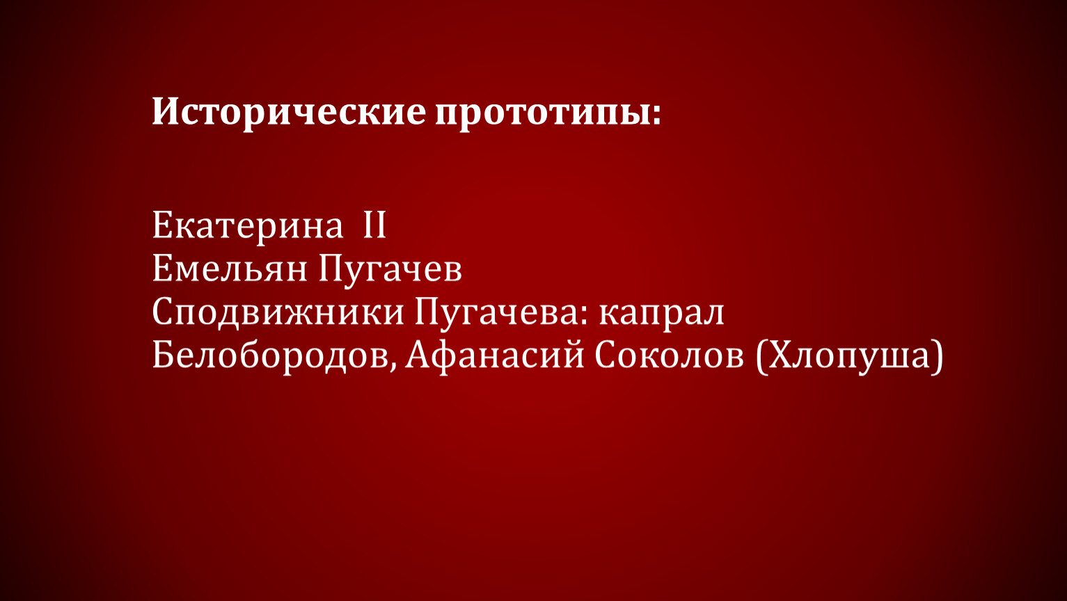 Главной сюжетной линией стало развитие реальных исторических событий. Вымышленные герои Пушкина имеют прототипы и их судьбы тесно переплетаются с историческими лицами.