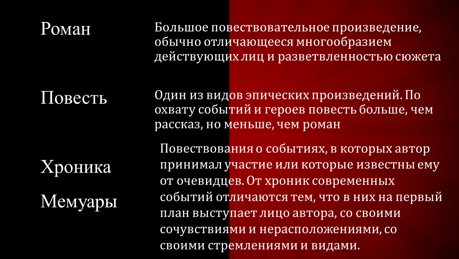 Один из видов эпических произведений. По охвату событий и героев повесть больше, чем рассказ, но меньше, чем роман