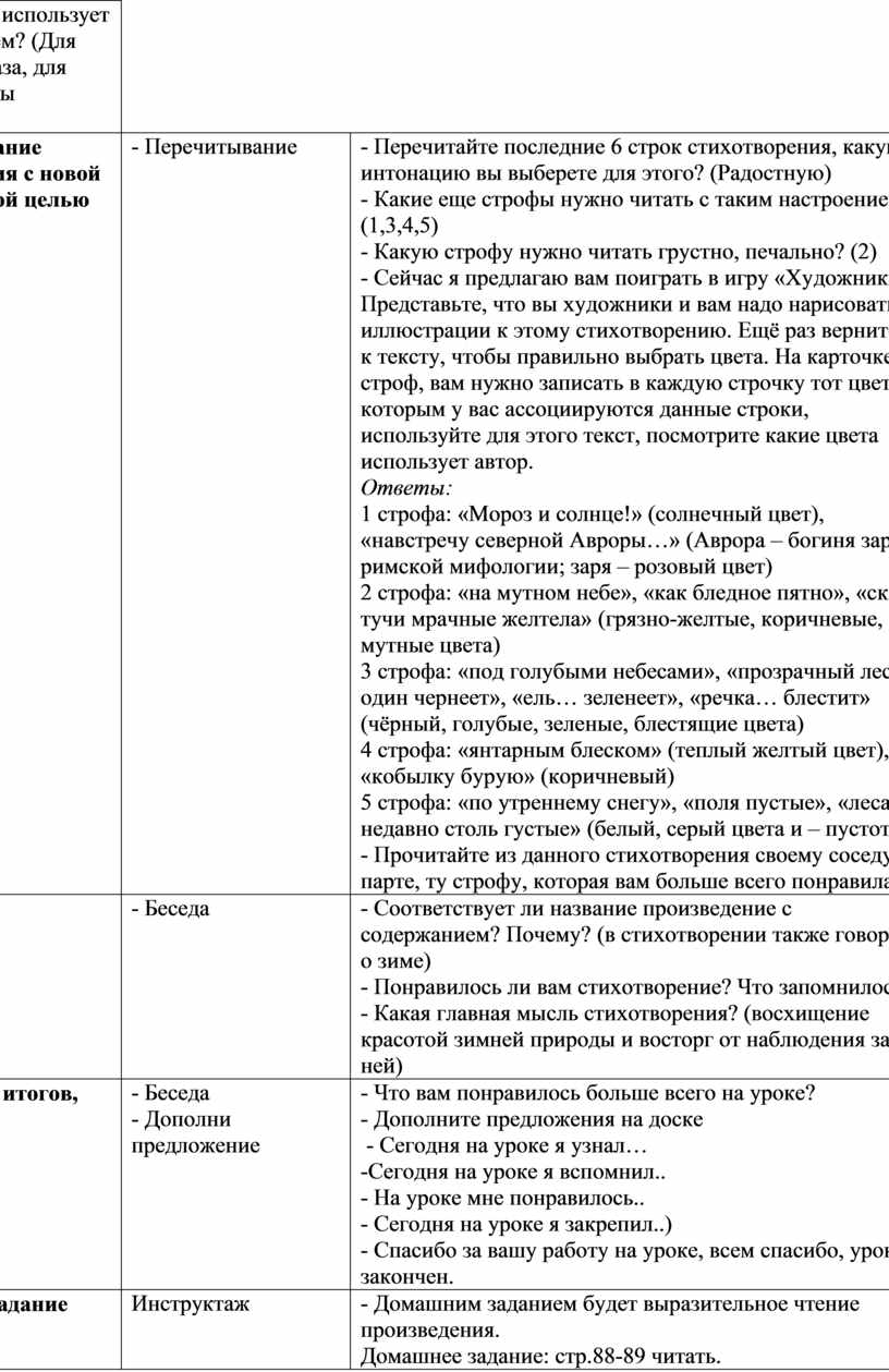 - Перечитайте последние 6 строк стихотворения, какую интонацию вы выберете для этого? (Радостную) - Какие еще строфы нужно читать с таким настроением? (1,3,4,5) - Какую строфу нужно читать грустно, печально? (2) - Сейчас я предлагаю вам поиграть в игру «Художники». Представьте, что вы художники и вам надо нарисовать иллюстрации к этому стихотворению. Ещё раз вернитесь к тексту, чтобы правильно выбрать цвета. На карточке 5 строф, вам нужно записать в каждую строчку тот цвет, с которым у вас ассоциируются данные строки, используйте для этого текст, посмотрите какие цвета использует автор. Ответы: 1 строфа: «Мороз и солнце!» (солнечный цвет), «навстречу северной Авроры…» (Аврора – богиня зари в римской мифологии; заря – розовый цвет) 2 строфа: «на мутном небе», «как бледное пятно», «сквозь тучи мрачные желтела» (грязно-желтые, коричневые, мутные цвета) 3 строфа: «под голубыми небесами», «прозрачный лес один чернеет», «ель… зеленеет», «речка… блестит» (чёрный, голубые, зеленые, блестящие цвета) 4 строфа: «янтарным блеском» (теплый желтый цвет), «кобылку бурую» (коричневый) 5 строфа: «по утреннему снегу», «поля пустые», «леса, недавно столь густые» (белый, серый цвета и – пустота) - Прочитайте из данного стихотворения своему соседу по парте, ту строфу, которая вам больше всего понравилась. |