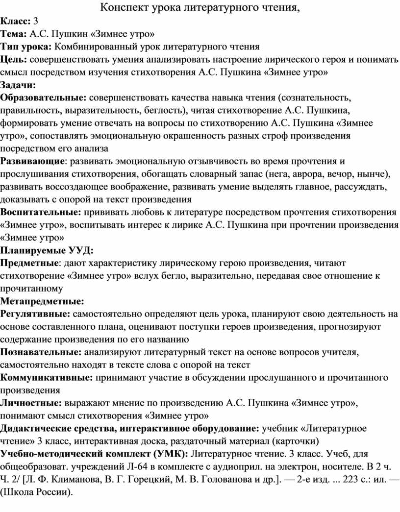 Предметные: дают характеристику лирическому герою произведения, читают стихотворение «Зимнее утро» вслух бегло, выразительно, передавая свое отношение к прочитанному