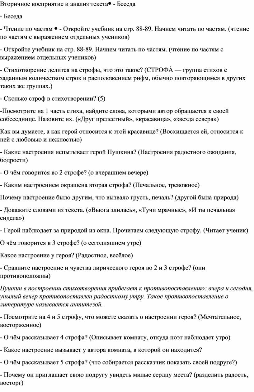 - Откройте учебник на стр. 88-89. Начнем читать по частям. (чтение по частям с выражением отдельных учеников) - Стихотворение делится на строфы, что это такое? (СТРОФА́ — группа стихов с заданным количеством строк и расположением рифм, обычно повторяющимся в других таких же группах.) - Сколько строф в стихотворении? (5) -Посмотрите на 1 часть стиха, найдите слова, которыми автор обращается к своей собеседнице. Назовите их. («Друг прелестный», «красавица», «звезда севера») Как вы думаете, а как герой относится к этой красавице? (Восхищается ей, относится к ней с любовью и нежностью) - Какие настроения испытывает герой Пушкина? (Настроения радостного ожидания, бодрости) - О чём говорится во 2 строфе? (о вчерашнем вечере) - Каким настроением окрашена вторая строфа? (Печальное, тревожное) Почему настроение было другим, что вызвало грусть, печаль? (другой была природа) - Докажите словами из текста. («Вьюга злилась», «Тучи мрачные», «И ты печальная сидела») - Герой наблюдает за природой из окна. Прочитаем следующую строфу. (Читает ученик) О чём говорится в 3 строфе? (о сегодняшнем утре) Какое настроение у героя? (Радостное, весёлое) - Сравните настроение и чувства лирического героя во 2 и 3 строфе? (они противоположны) Пушкин в построении стихотворения прибегает к противопоставлению: вчера и сегодня, унылый вечер противопоставлен радостному утру. Такое противопоставление в литературе называется антитезой. - Посмотрите на 4 и 5 строфу, что можете сказать о настроении героя? (Мечтательное, восторженное) - О чём рассказывает 4 строфа? (Описывает комнату, откуда поэт наблюдает утро) - Какое настроение вызывает у автора комната, в которой он находится? - О чём рассказывает 5 строфа? (что собирается рассказчик показать своей подруге?) - Почему он приглашает свою подругу увидеть милые сердцу места? (разделить радость, восторг) - В этой строфе речь идёт уже не о кобылке, а о нетерпеливом коне. В чём разница между бурой кобылкой и нетерпеливым конём? (разница в движении) - Вы заметили, что в одном стихотворении могут уживаться разные настроения, не только близкие, но и противоположные, контрастные, такой прием называется антитезой или противопоставлением. Как вы думаете, почему поэт использует данный прием? (Для яркости образа, для большей силы выражения) |