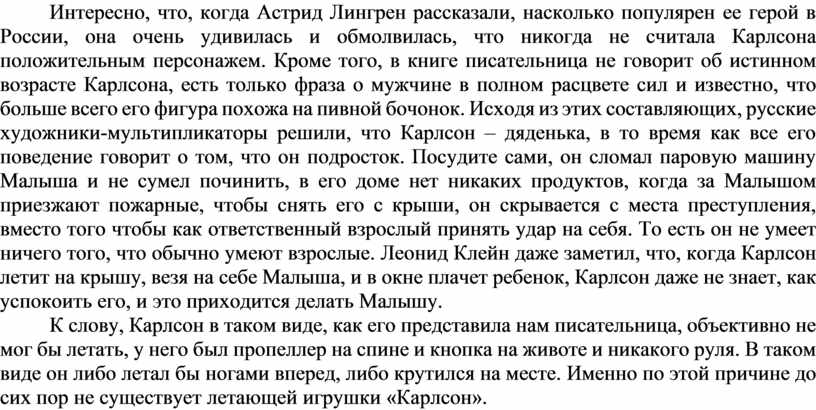 Интересно, что, когда Астрид Лингрен рассказали, насколько популярен ее герой в России, она очень удивилась и обмолвилась, что никогда не считала Карлсона положительным персонажем. Кроме того, в книге писательница не говорит об истинном возрасте Карлсона, есть только фраза о мужчине в полном расцвете сил и известно, что больше всего его фигура похожа на пивной бочонок. Исходя из этих составляющих, русские художники-мультипликаторы решили, что Карлсон – дяденька, в то время как все его поведение говорит о том, что он подросток. Посудите сами, он сломал паровую машину Малыша и не сумел починить, в его доме нет никаких продуктов, когда за Малышом приезжают пожарные, чтобы снять его с крыши, он скрывается с места преступления, вместо того чтобы как ответственный взрослый принять удар на себя. То есть он не умеет ничего того, что обычно умеют взрослые. Леонид Клейн даже заметил, что, когда Карлсон летит на крышу, везя на себе Малыша, и в окне плачет ребенок, Карлсон даже не знает, как успокоить его, и это приходится делать Малышу.