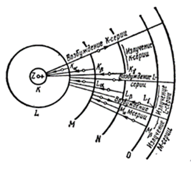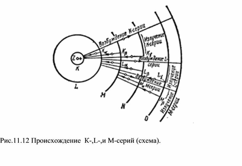 Рис.11.12 Происхождение К-,L-,и М-серий (схема).