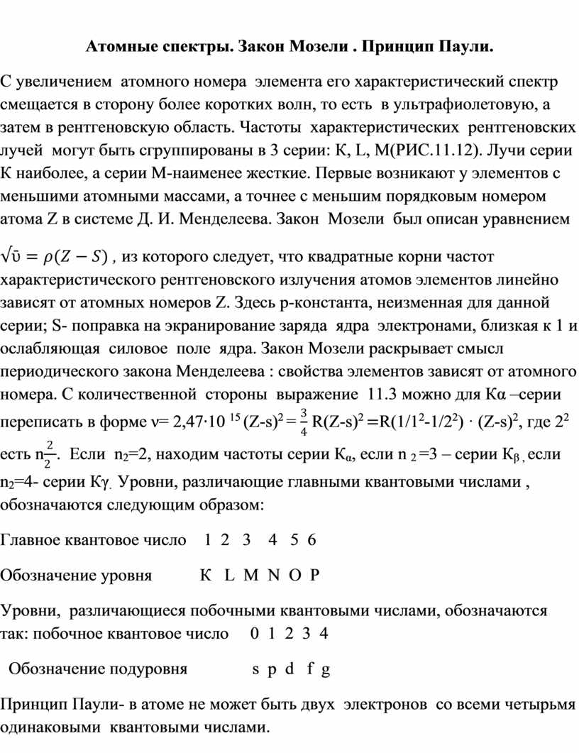 Атомные спектры. Закон Мозели . Принцип Паули.
