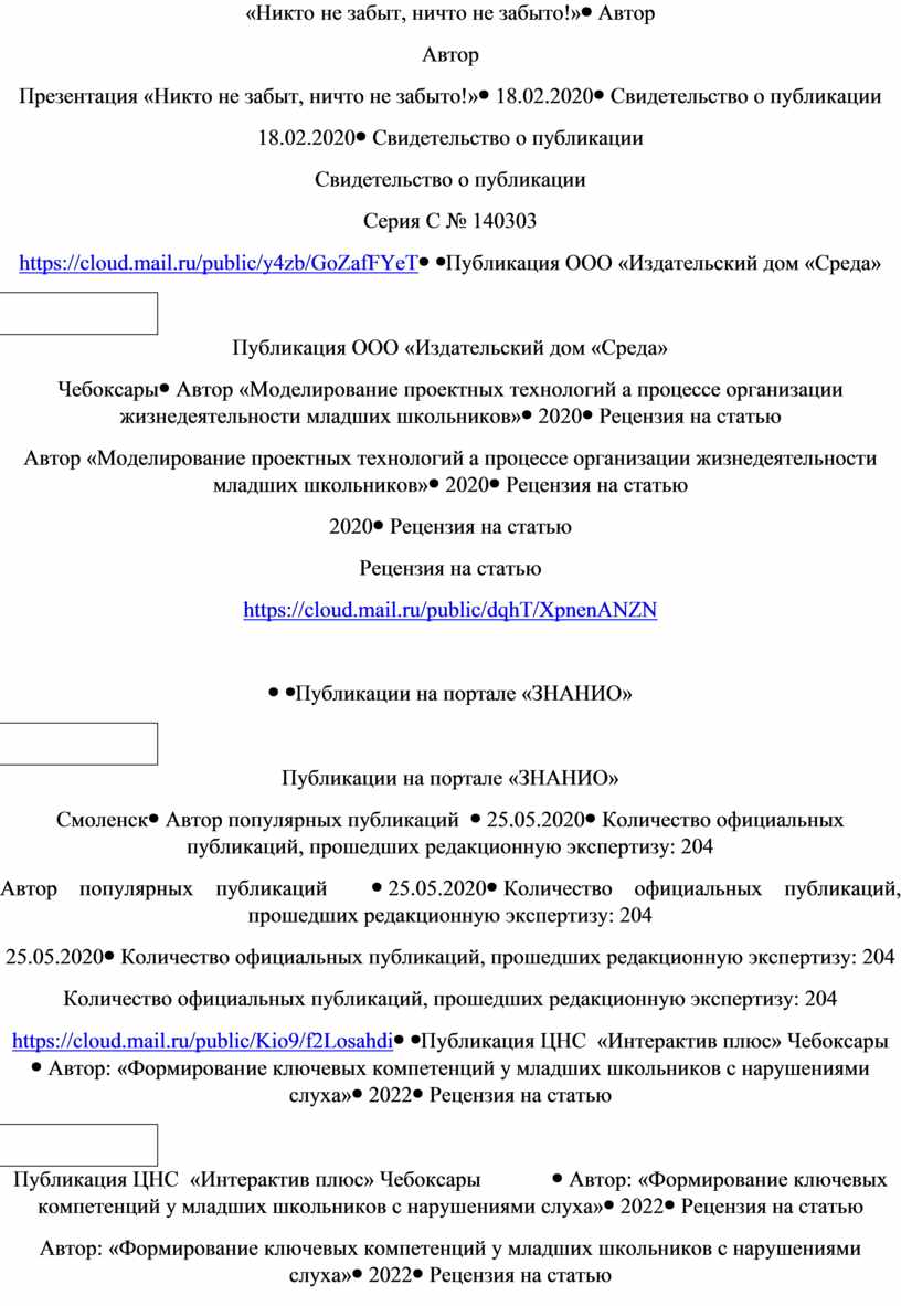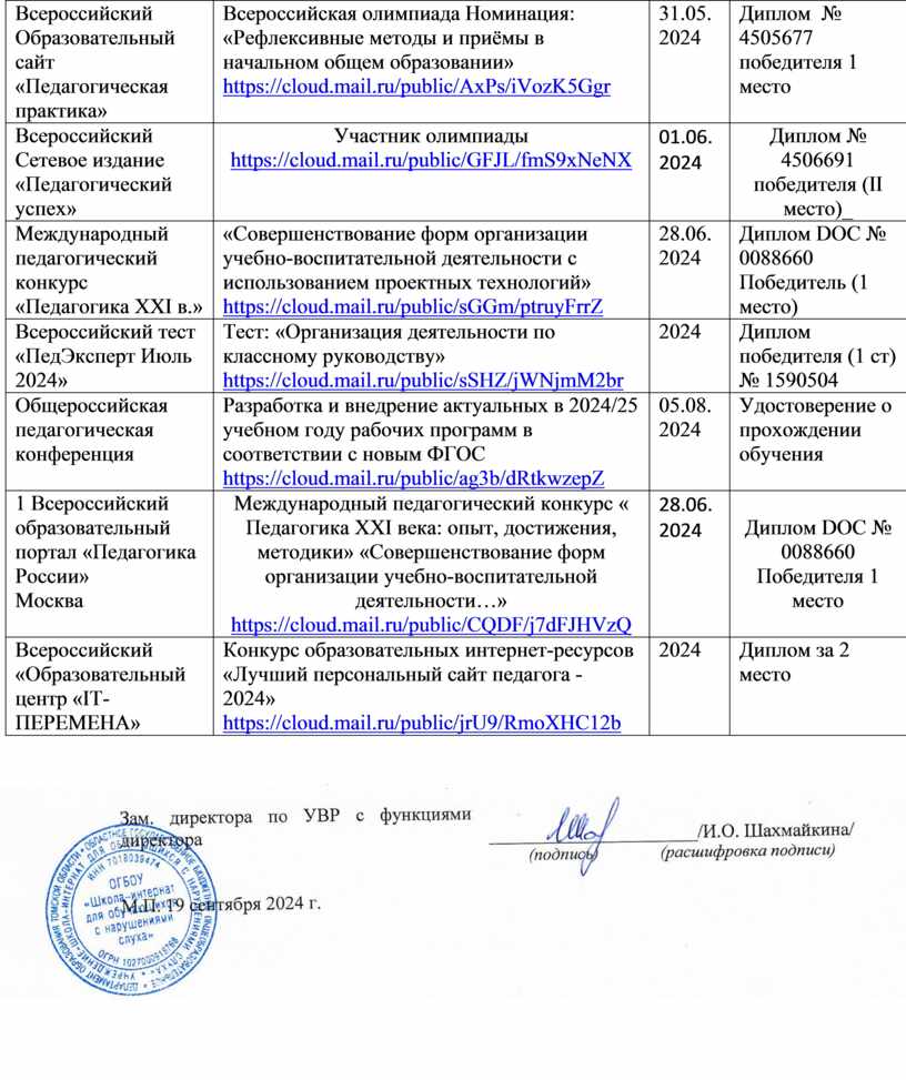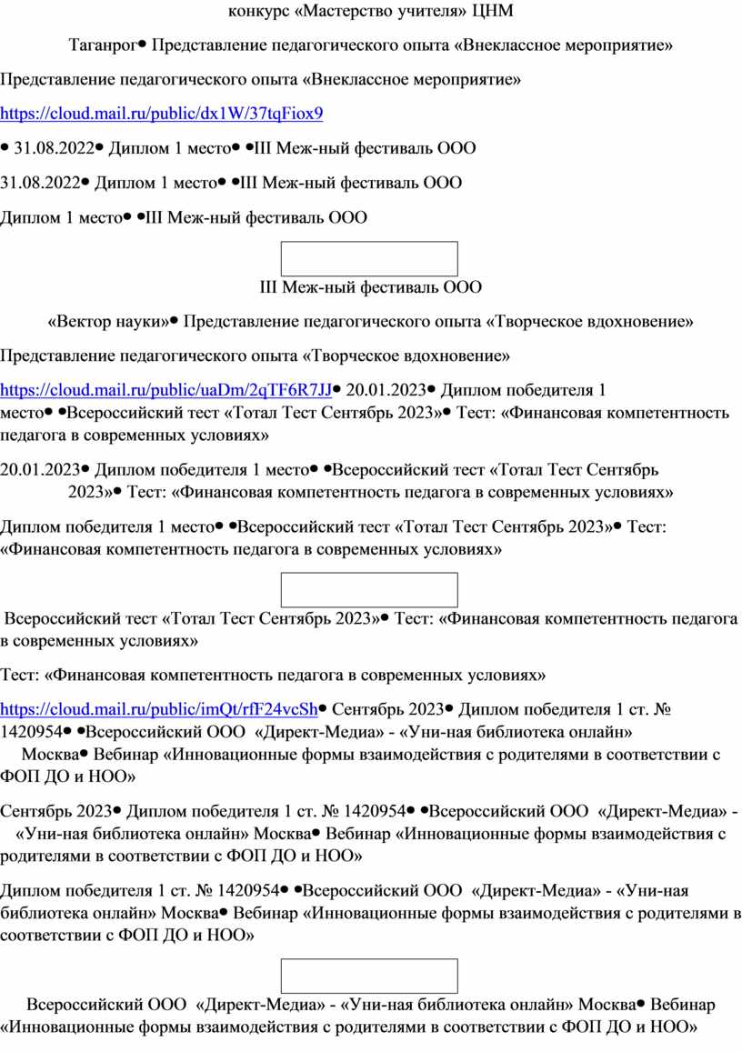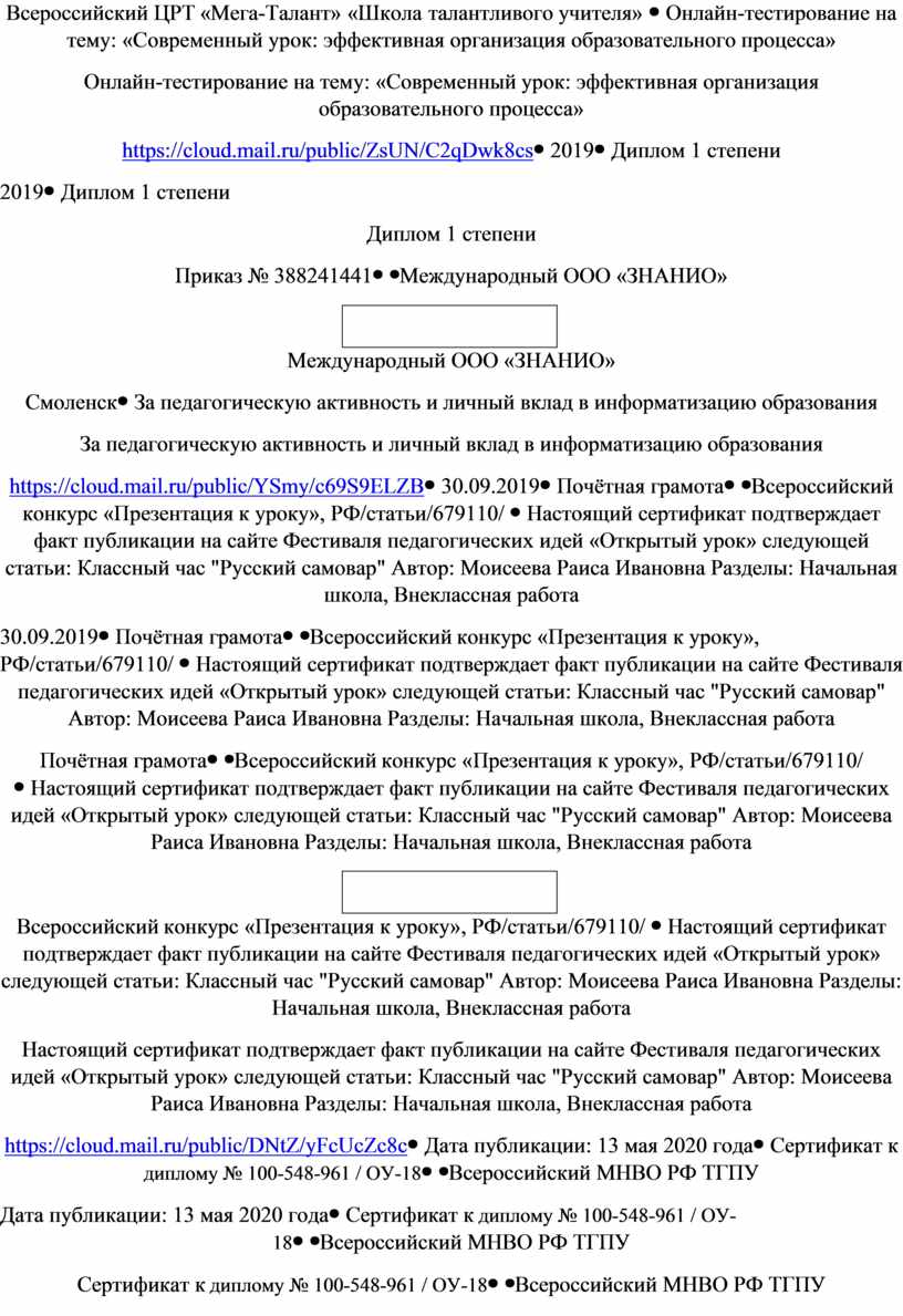 Конкурс «Презентация к уроку на Всероссийском фестивале «Педагогических идей» https://cloud.mail.ru/public/fPtw/h5BUtwRAg Сертификат к диплому https://cloud.mail.ru/public/Zmgi/YhuGHxVwG |