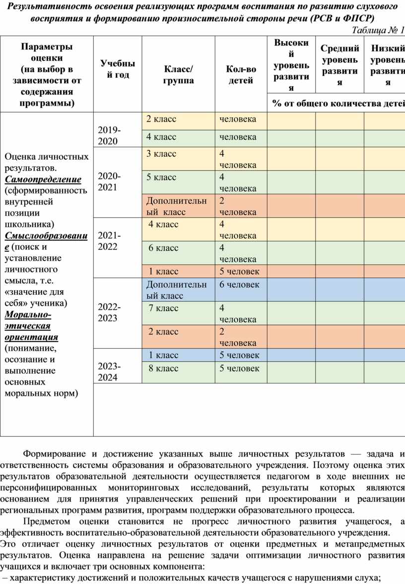 1. Результативность освоения реализующих программ воспитания по развитию слухового восприятия и формированию произносительной стороны речи (РСВ и ФПСР)