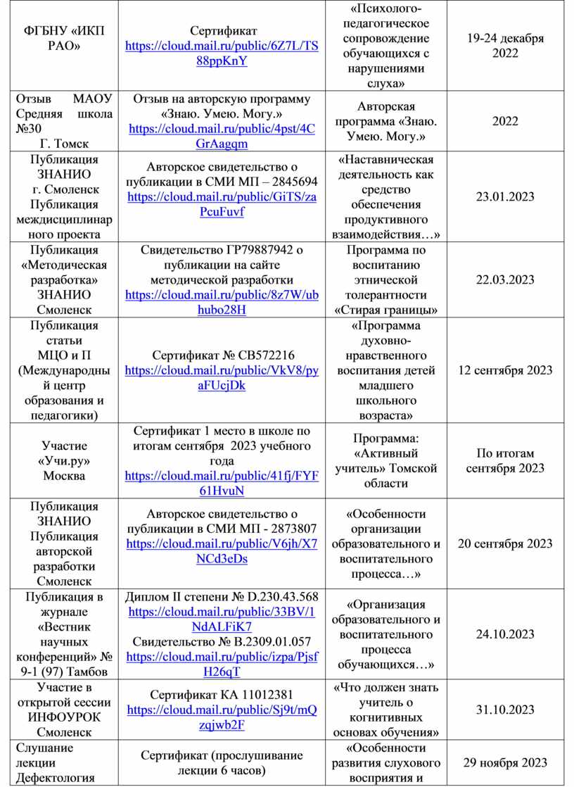 Представление педагогического опыта на Международном уровне «Коррекционно-педагогическая деятельность учителя-сурдопедагога» https://cloud.mail.ru/public/vAaH/p6dSg6Tfd |