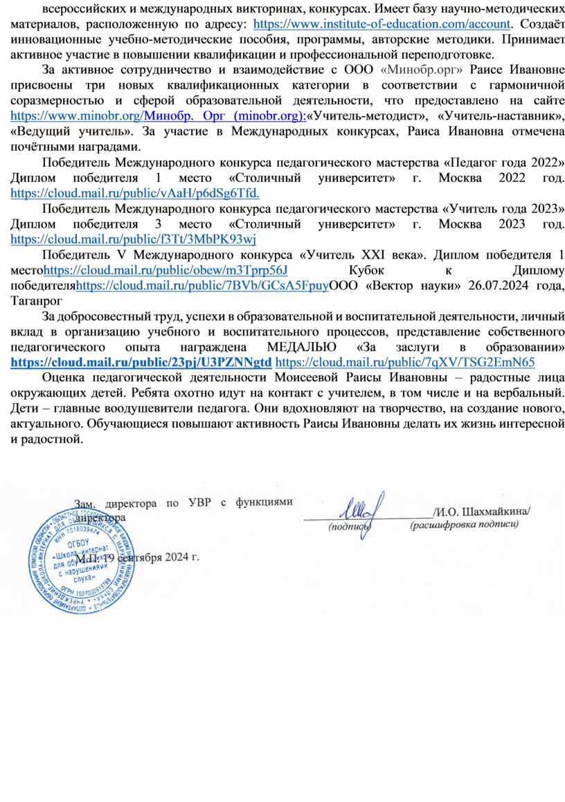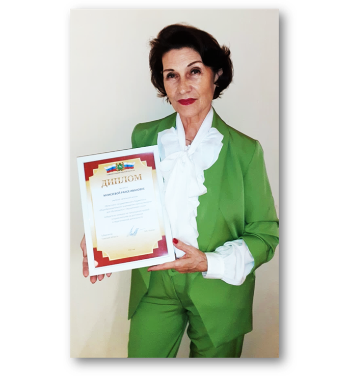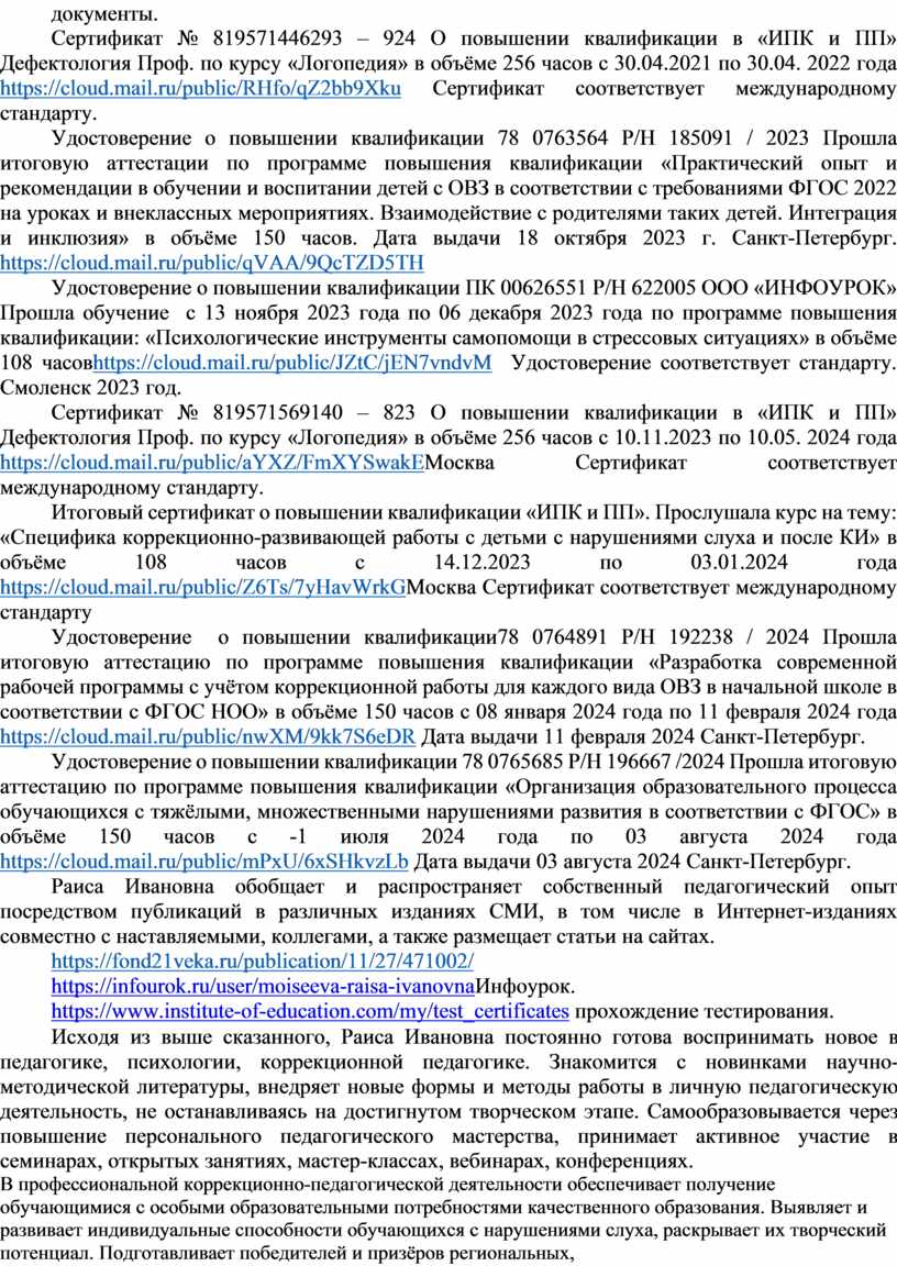 ЧОУ ДПО «Институт повышения квалификации и профессиональной переподготовки» Диплом ПП № 0102310 о профессиональной переподготовке с 17 января 2024 года по 20 апреля 2024 года. Р/Н 192609/2024. Моисеева Раиса Ивановна прошла профессиональную переподготовку по программе профессиональной переподготовки «Специальное (дефектологическое) образование: Олигофренопедагогика». Присвоена квалификация «Учитель-дефектолог, олигофренопедагог» 2024 г. город Санкт-Петербург. https://cloud.mail.ru/public/NJug/vPxn54YwA