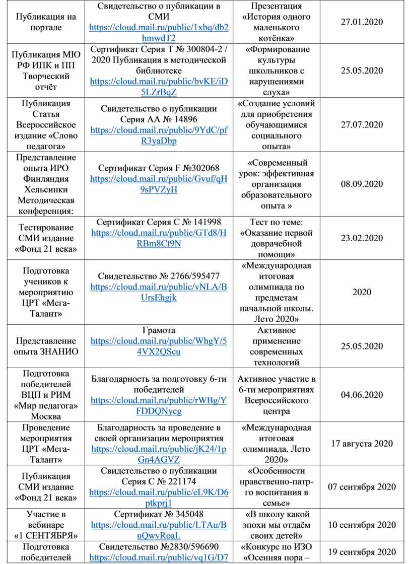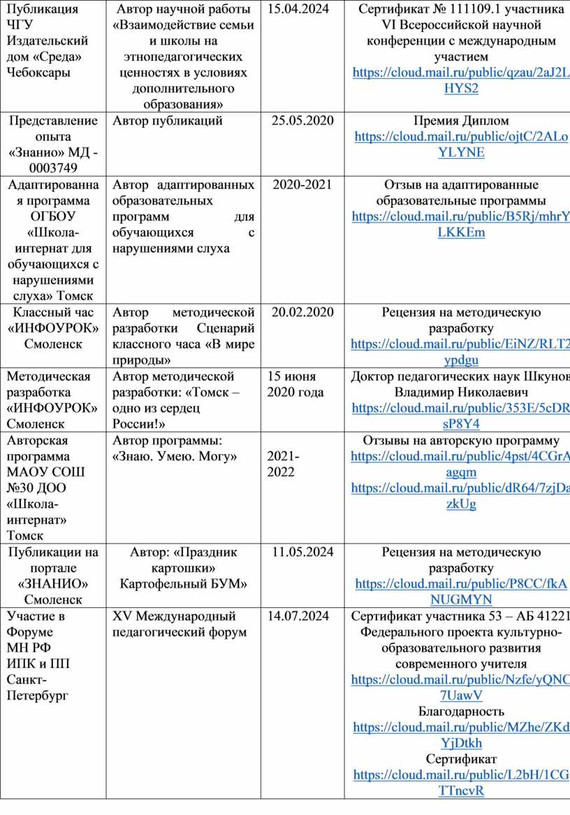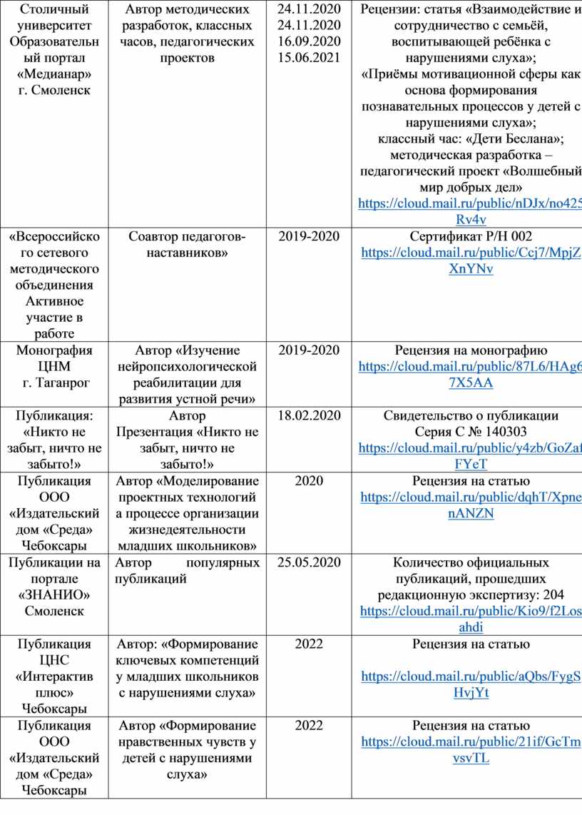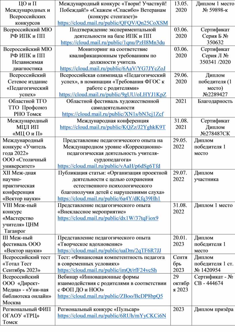Представление педагогического опыта на Международном уровне «Коррекционно-педагогическая деятельность учителя-сурдопедагога» https://cloud.mail.ru/public/vAaH/p6dSg6Tfd |