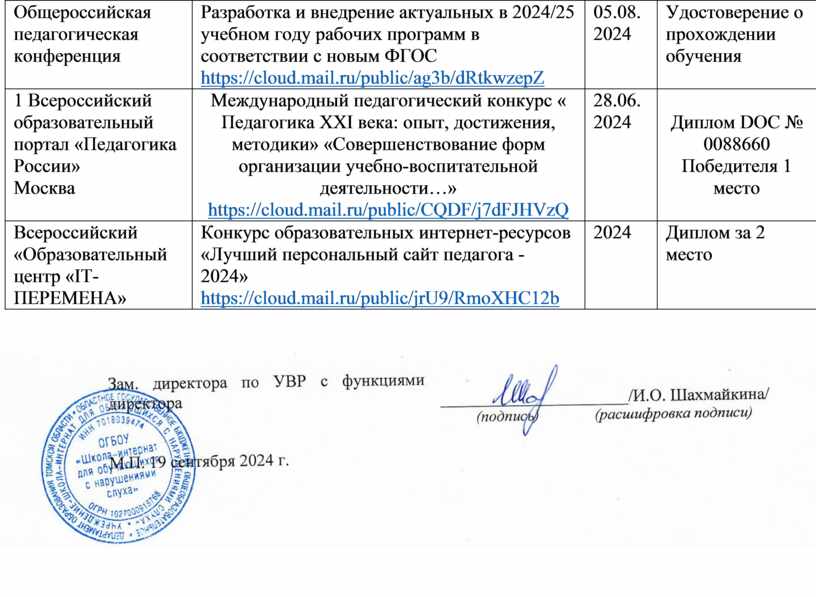 Итоговый сертификат о повышении квалификации «ИПК и ПП». Прослушала курс на тему: «Специфика коррекционно-развивающей работы с детьми с нарушениями слуха и после КИ» в объёме 108 часов с 14.12.2023 по 03.01.2024 года https://cloud.mail.ru/public/Z6Ts/7yHavWrkGМосква Сертификат соответствует международному стандарту