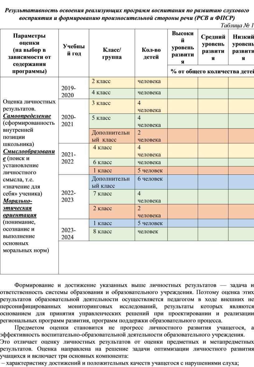 1. Результативность освоения реализующих программ воспитания по развитию слухового восприятия и формированию произносительной стороны речи (РСВ и ФПСР)