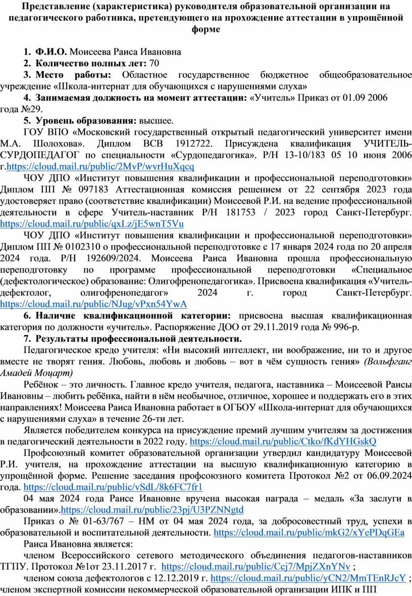 Представление (характеристика) руководителя образовательной организации на педагогического работника, претендующего на прохождение аттестации в упрощённой форме