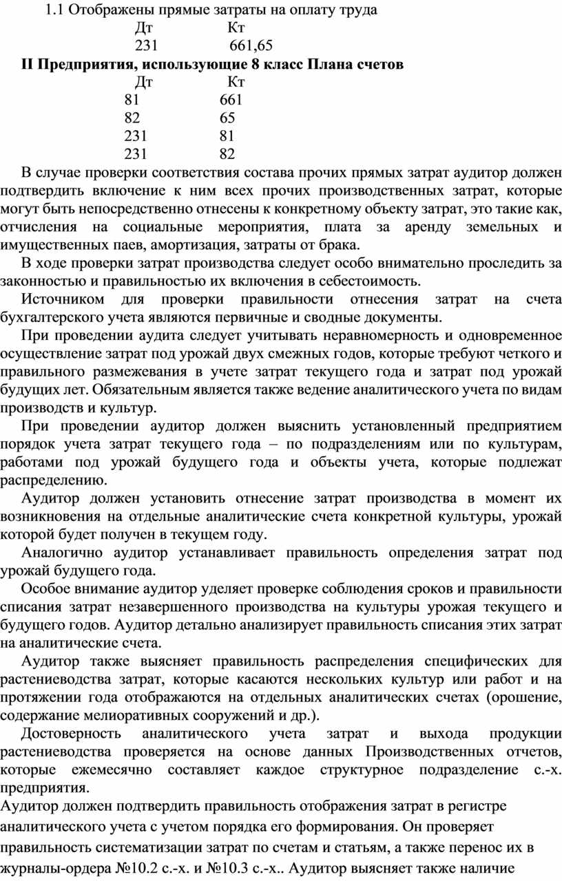 Аудитор должен установить отнесение затрат производства в момент их возникновения на отдельные аналитические счета конкретной культуры, урожай которой будет получен в текущем году.