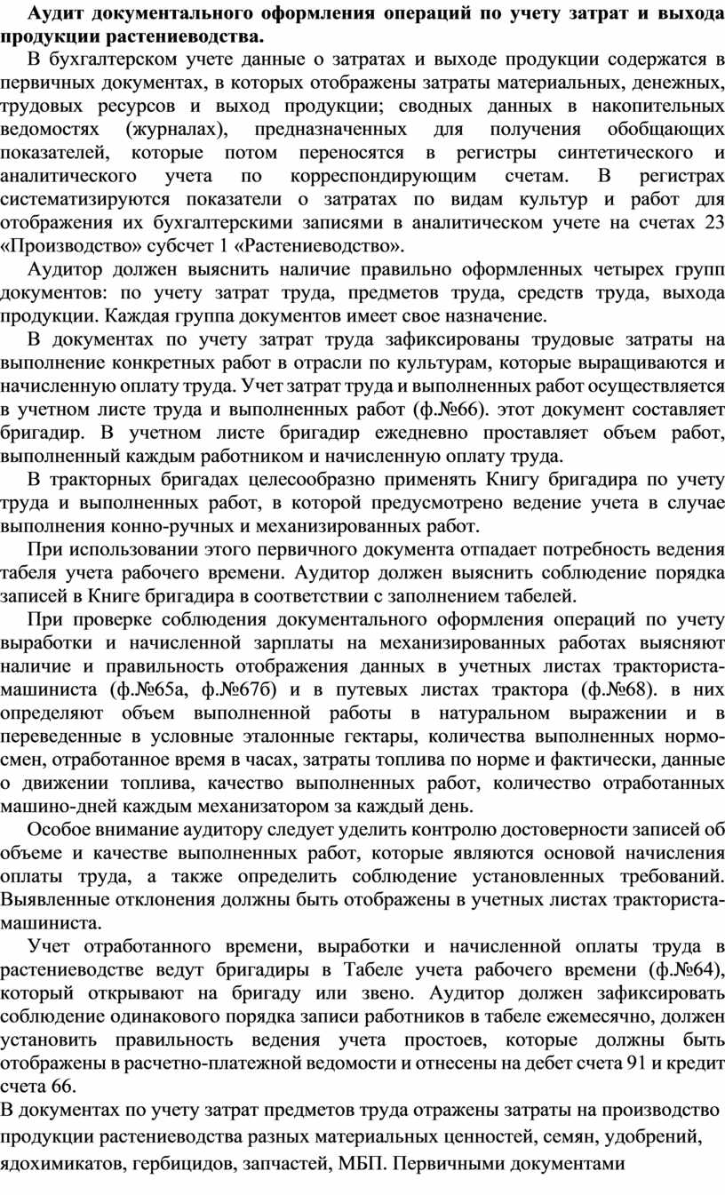 Аудит документального оформления операций по учету затрат и выхода продукции растениеводства.