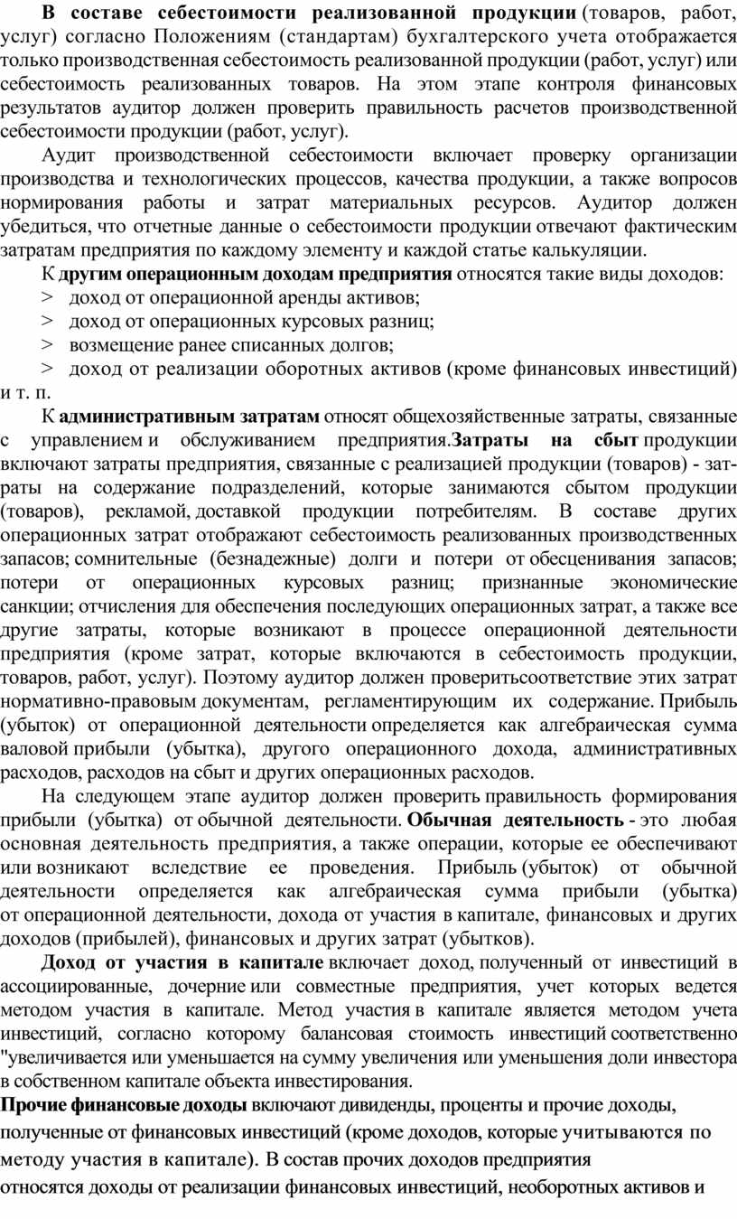 В составе себестоимости реализованной продукции (товаров, работ, услуг) согласно Положениям (стандартам) бухгалтерского учета отображается только производственная себестоимость реализованной продукции (работ, услуг) или себестоимость реализованных товаров. На этом этапе контроля финансовых результатов аудитор должен проверить правильность расчетов производственной себестоимости продукции (работ, услуг).