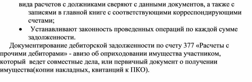 Документирование дебиторской задолженности по счету 377 «Расчеты с прочими дебиторами» - авизо об оприходовании имущества участником, который ведет совместные дела, или первичный документ о получении имущества(копии накладных, квитанций к ПКО).