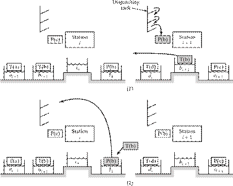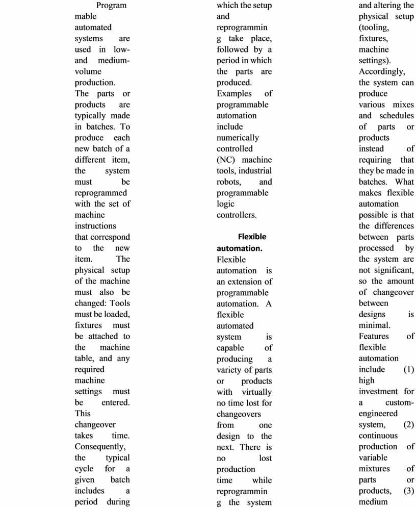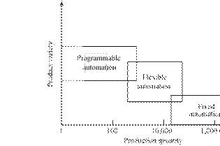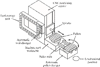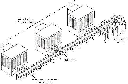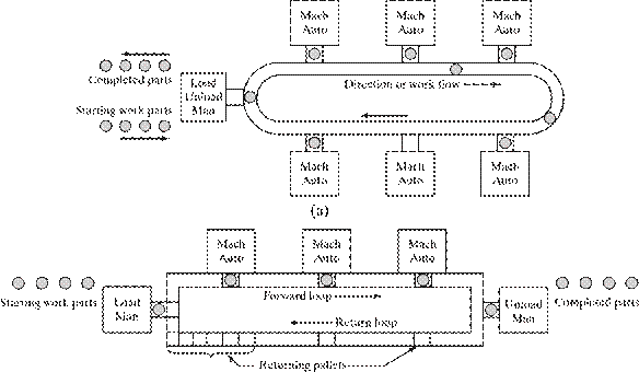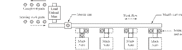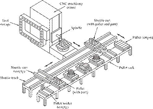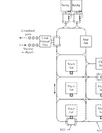 [29] The dividing line that separates an FMS from an FMC is defined here to be four machines. It should be noted that not all practitioners would agree with that dividing line; some might prefer a higher value, while others would prefer a lower value. Also, the distinction between cell and system seems to apply only to flexible manufacturing systems that are automated. The manually operated counterparts of these systems, discussed in Chapter 18, seem to always be referred to as cells, no matter how many workstations are included.