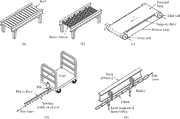 [20] Exceptions exist. Some conveyor systems use vehicles to carry loads. Examples include the in-floor tow line conveyor and the cart-on-track conveyor.