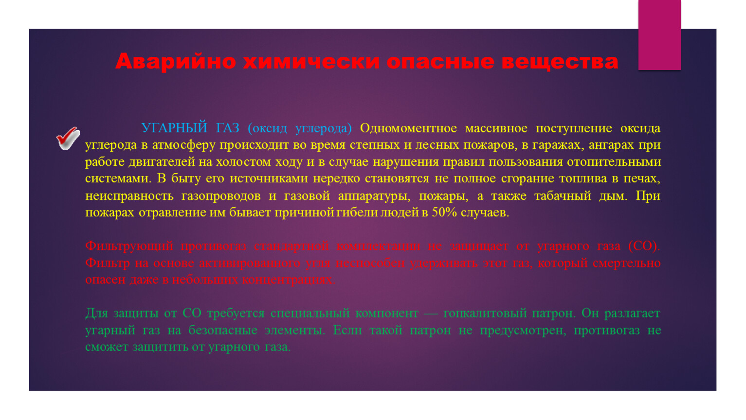 Фильтрующий противогаз стандартной комплектации не защищает от угарного газа (CO). Фильтр на основе активированного угля неспособен удерживать этот газ, который смертельно опасен даже в небольших концентрациях.