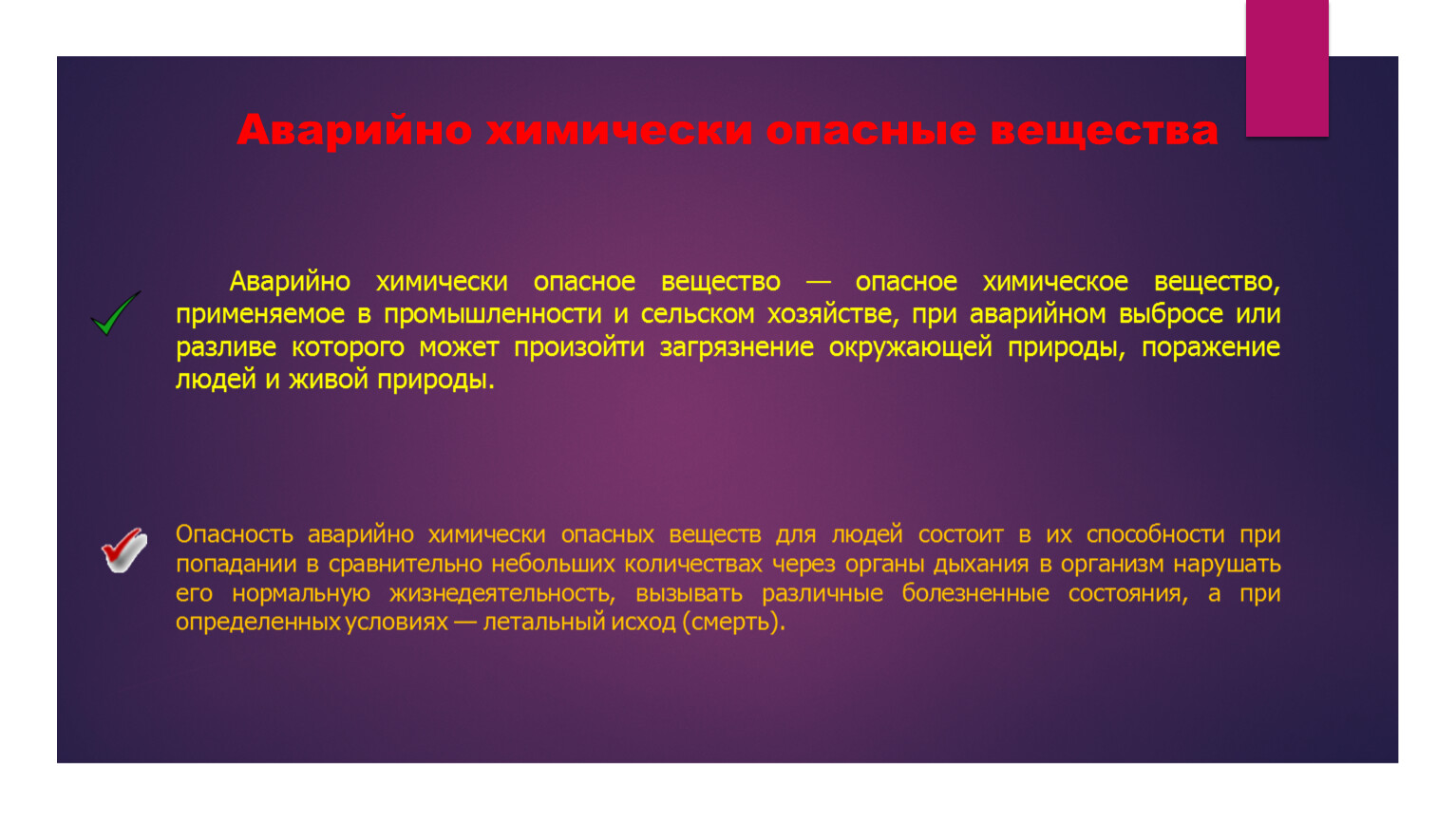 Опасность аварийно химически опасных веществ для людей состоит в их способности при попадании в сравнительно небольших количествах через органы дыхания в организм нарушать его нормальную жизнедеятельность, вызывать различные болезненные состояния, а при определенных условиях — летальный исход (смерть).