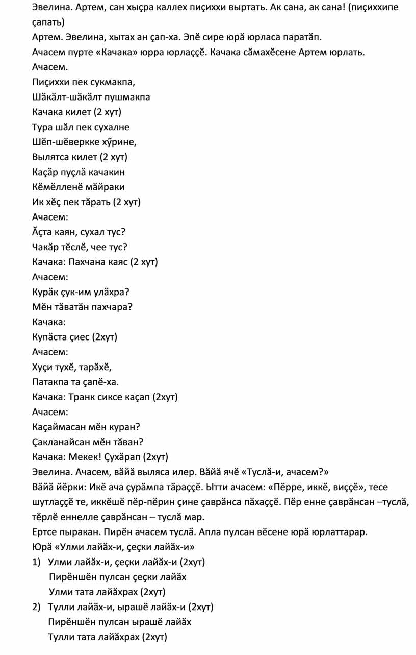 Ертсе пыракан: Ырӑ кун пултӑр пурне те. Эпир паян сирӗн пата чӑваш ача-пӑча вӑййисене, юррисене илсе килтӗмӗр. Епле капӑр тӑхӑнса килнӗ. Мӗнле илемлӗ чӑваш ҫи-пуҫӗ,тӗрри! Чӑваш халӑхӗ мӗн авалтанах ӗҫчен пулнипе палӑрса тӑнӑ.хальхи вӑхӑтра та вӗсем уй-хирте те ӗҫлеҫҫӗ, алӑ ӗҫне те пултараҫҫӗ, юрӑ-ташӑра та ӑста.