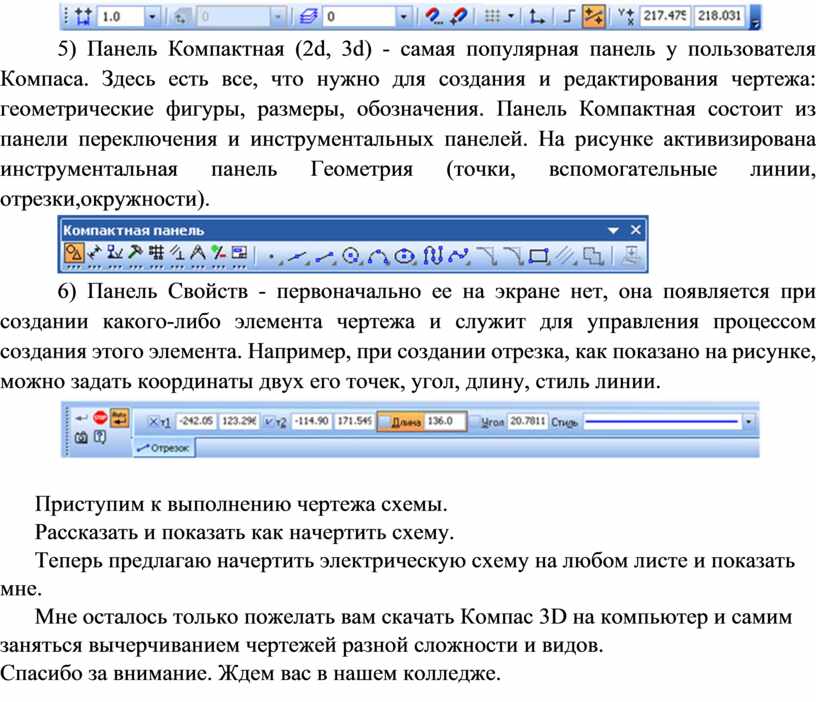 5) Панель Компактная (2d, 3d) - самая популярная панель у пользователя Компаса. Здесь есть все, что нужно для создания и редактирования чертежа: геометрические фигуры, размеры, обозначения. Панель Компактная состоит из панели переключения и инструментальных панелей. На рисунке активизирована инструментальная панель Геометрия (точки, вспомогательные линии, отрезки,окружности).