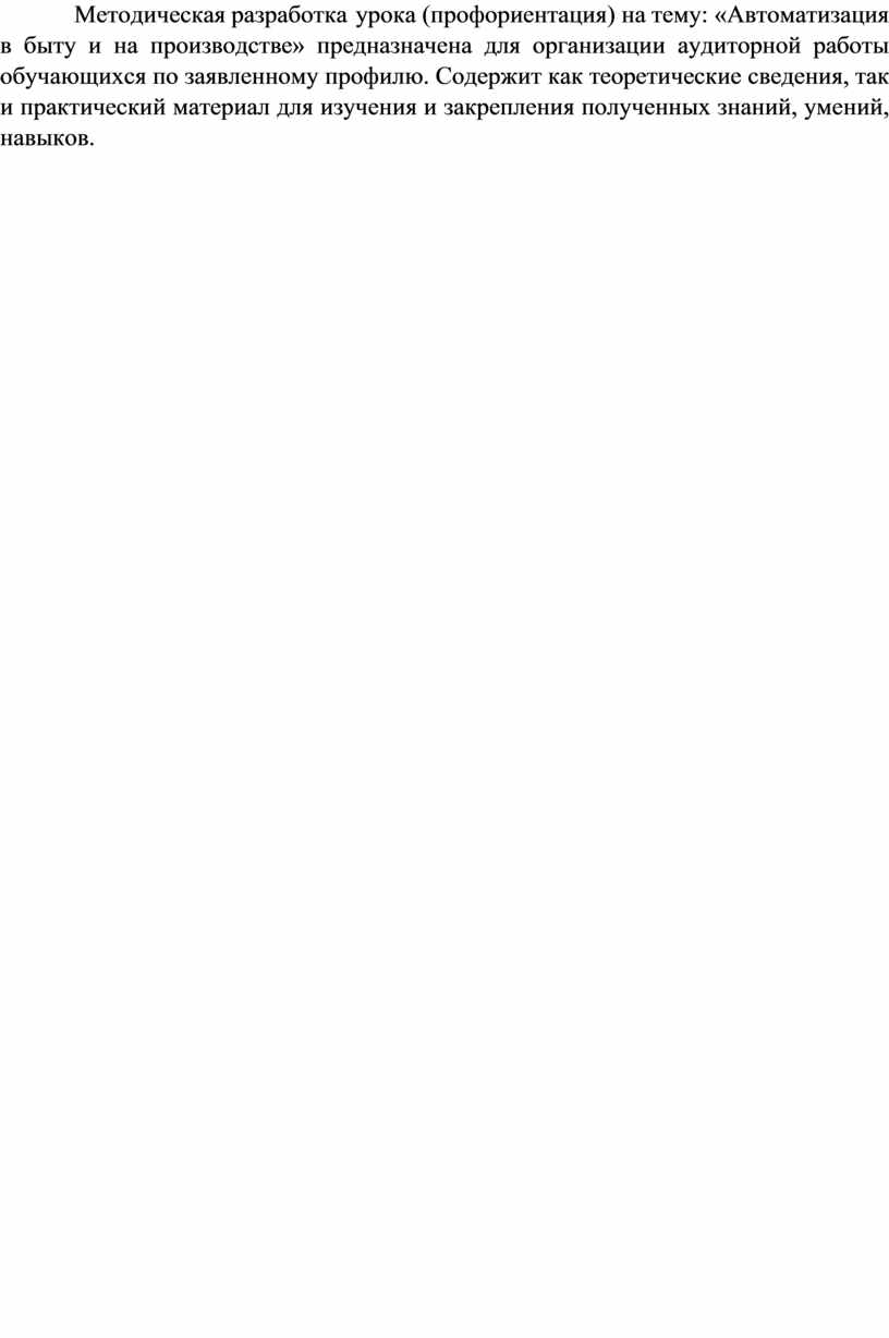 Методическая разработка урока (профориентация) на тему: «Автоматизация в быту и на производстве» предназначена для организации аудиторной работы обучающихся по заявленному профилю. Содержит как теоретические сведения, так и практический материал для изучения и закрепления полученных знаний, умений, навыков.