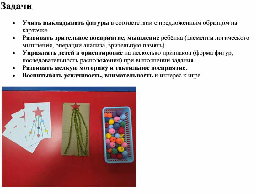 · Учить выкладывать фигуры в соответствии с предложенным образцом на карточке.