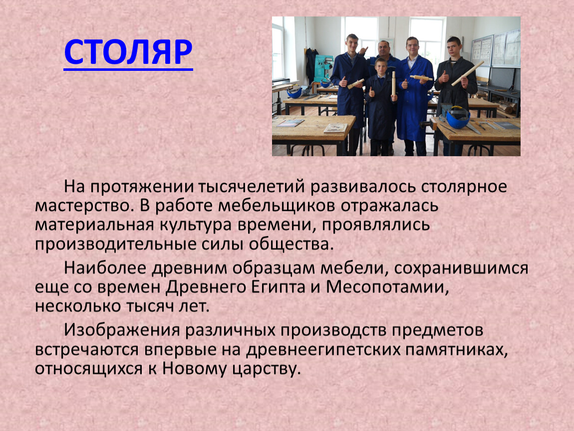 На протяжении тысячелетий развивалось столярное мастерство. В работе мебельщиков отражалась материальная культура времени, проявлялись производительные силы общества.