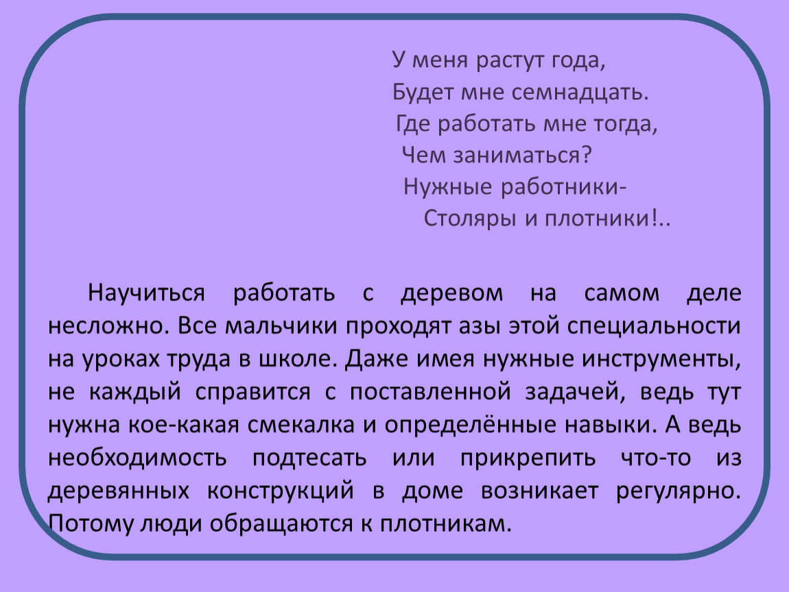 У меня растут года, Будет мне семнадцать. Где работать мне тогда, Чем заниматься? Нужные работники- Столяры и плотники!..