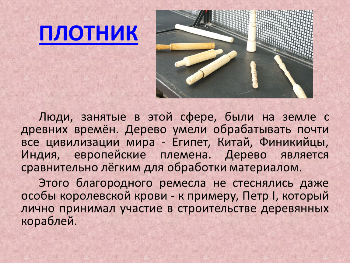 ПЛОТНИК - это старинное и необходимое для общества ремесло. По определению, плотник - одна из строительных специальностей, но такие же специалисты работают на производстве мебели, деревянных окон, дверей, лодок и прочих полезных изделий.