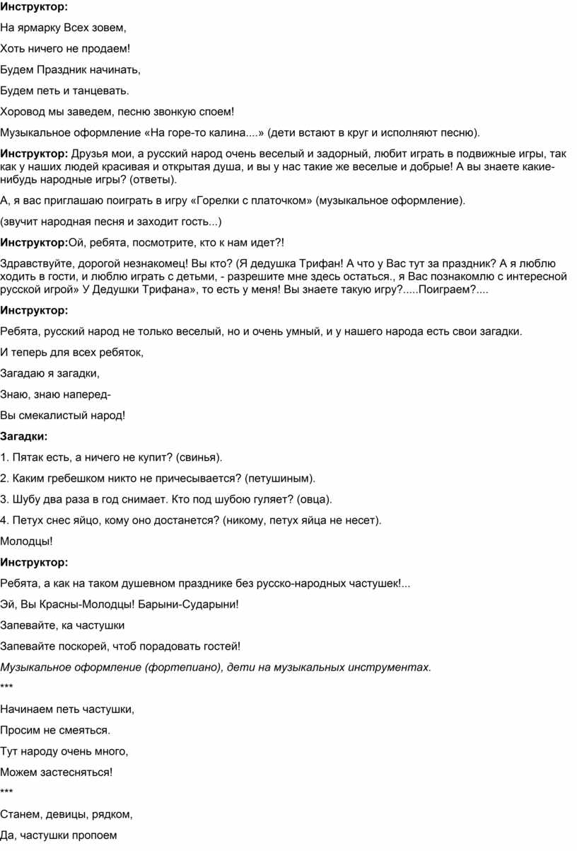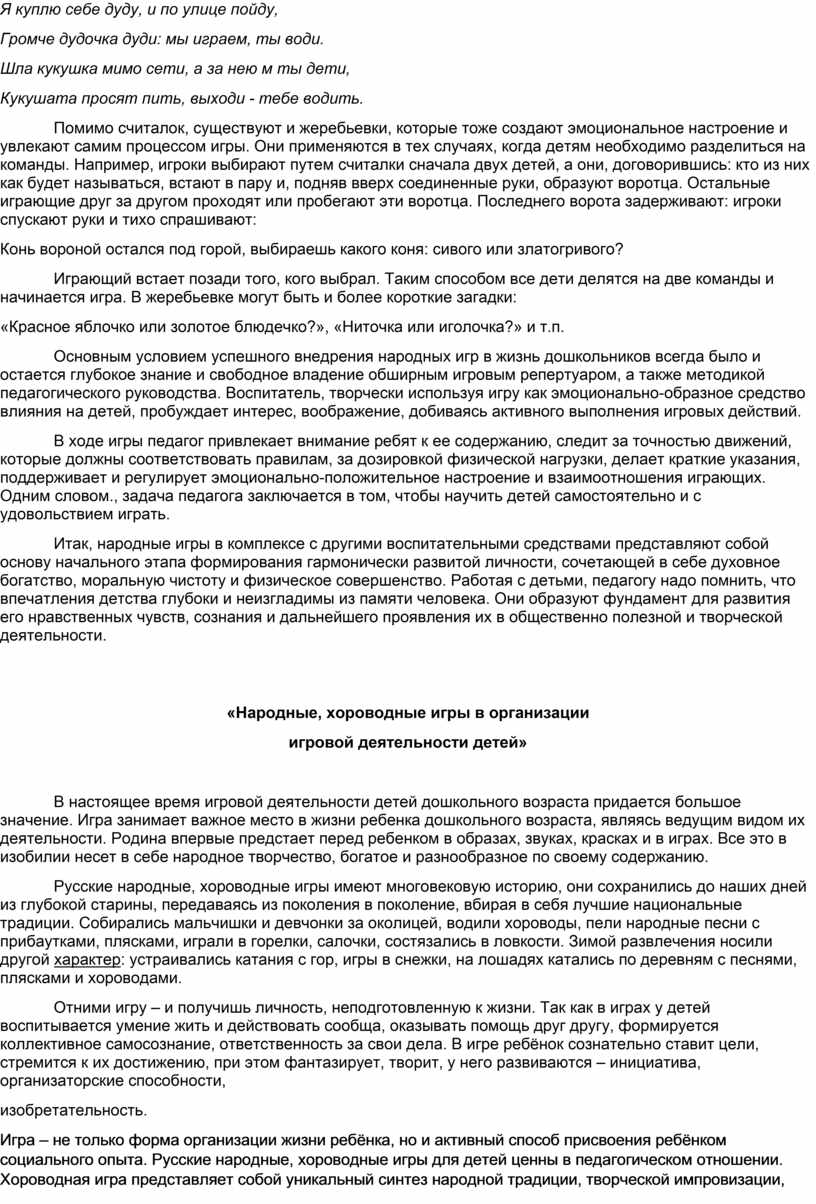 взаимопомощь, уважение к человеку: что особенности жизни и труда людей зависят от природно-климатических условий (на севере распространено оленеводство, рыболовство, в южных степных районах преобладает коневодство, на юге выращивают хлопок и т.д.). Это находит отражение в народных песнях, сказаниях, в движениях танца и игры. Все свои жизненные впечатления и переживания малыши отражают в условно-игровой форме, способствующей конкретному перевоплощению в образ «Гуси-лебеди», «Коршун и наседка», «У медведя во бору», «Олени и пастухи» и т.д.). Игровая ситуация увлекает и воспитывает ребенка, а встречающиеся в некоторых играх зачины, диалоги непосредственно характеризуют персонажи их действия, которые надо умело подчеркнуть в образе, что требует от детей активной умственной деятельности.