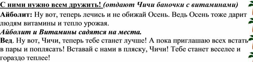 Айболит: Ну вот, теперь лечись и не обижай Осень. Ведь Осень тоже дарит людям витамины и тепло урожая.
