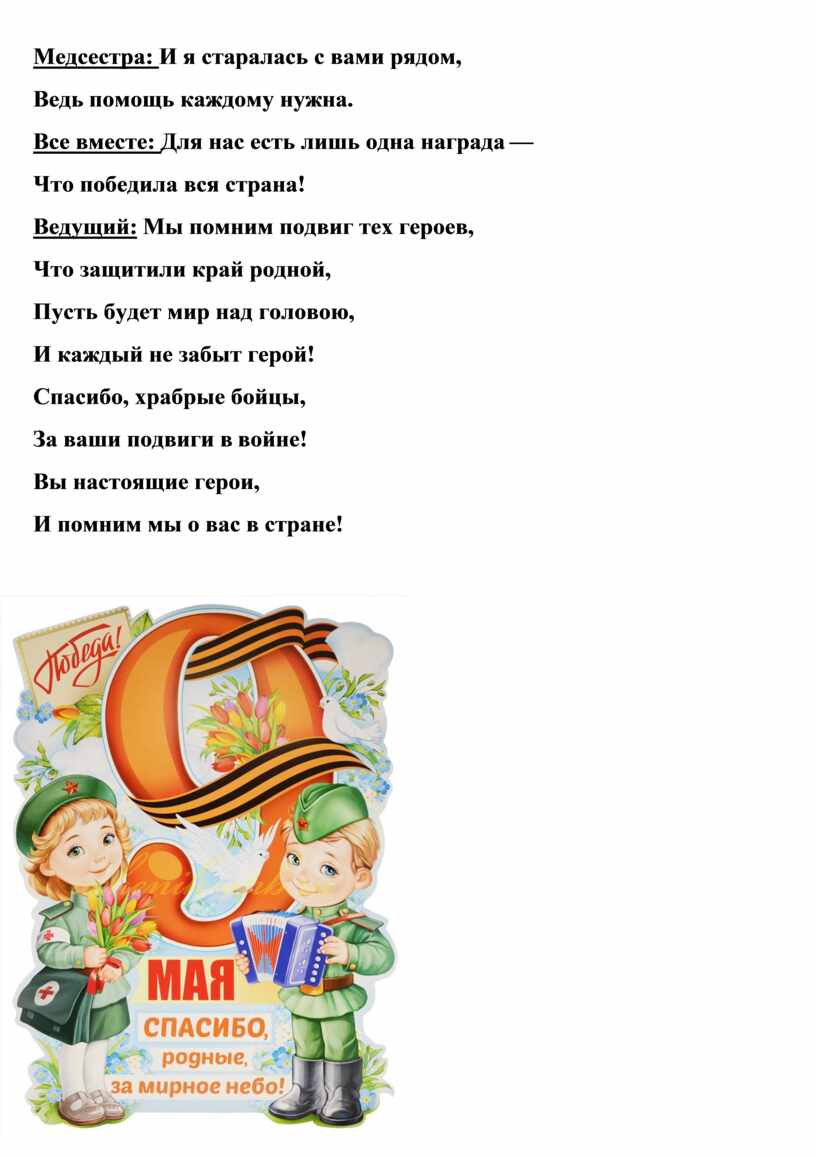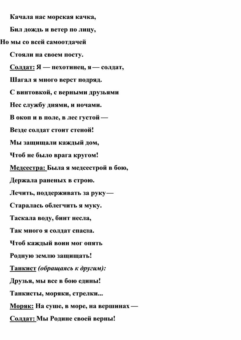 Действующие лица: Ведущий, танкист, моряк, солдат, медсестра