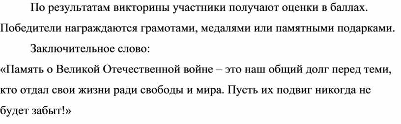 По результатам викторины участники получают оценки в баллах. Победители награждаются грамотами, медалями или памятными подарками.