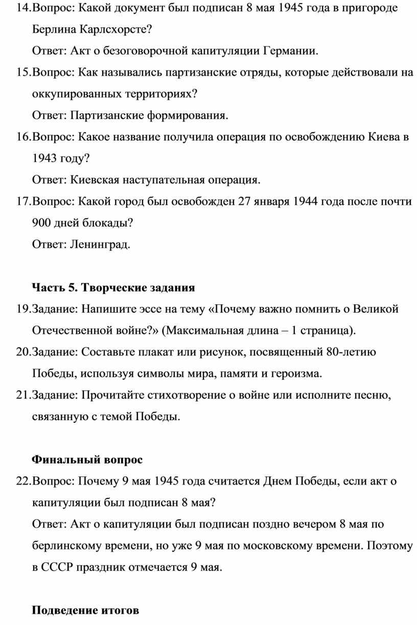 Ответ: Акт о капитуляции был подписан поздно вечером 8 мая по берлинскому