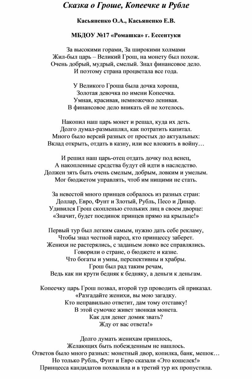 Сказка о Гроше, Копеечке и Рубле