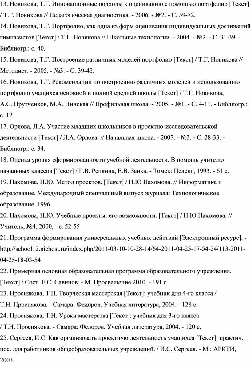 14. Новикова, Т.Г. Портфолио, как одна из форм оценивания индивидуальных достижений гимназистов [Текст] / Т.Г. Новикова // Школьные технологии. - 2004. - №2. - С. 31-39. - Библиогр.: с. 40.