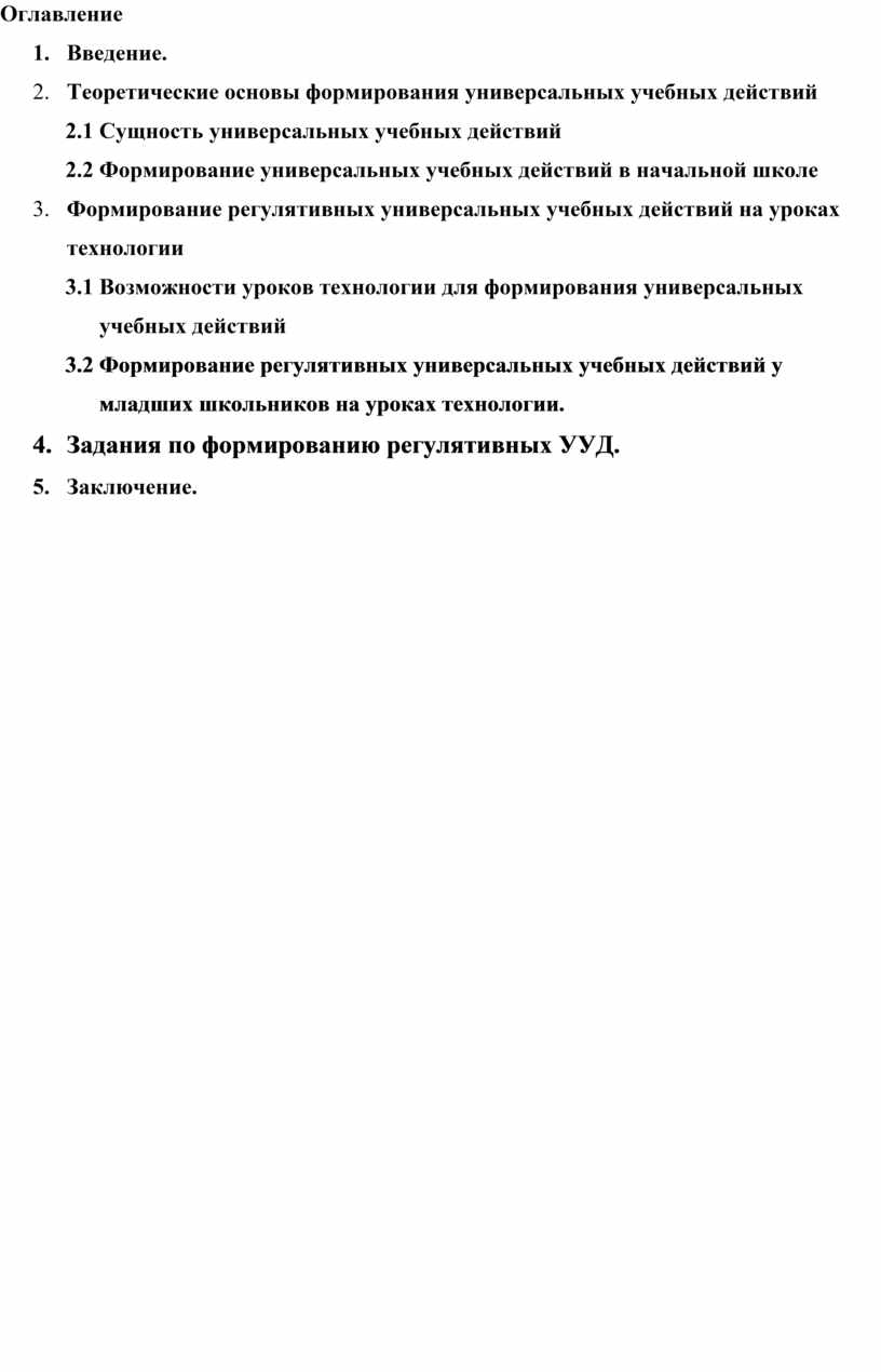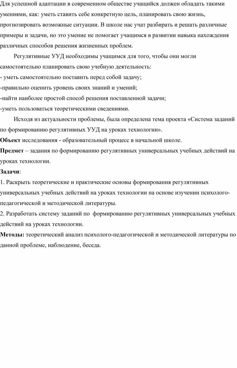 1. Раскрыть теоретические и практические основы формирования регулятивных универсальных учебных действий на уроках технологии на основе изучении психолого-педагогической и методической литературы.