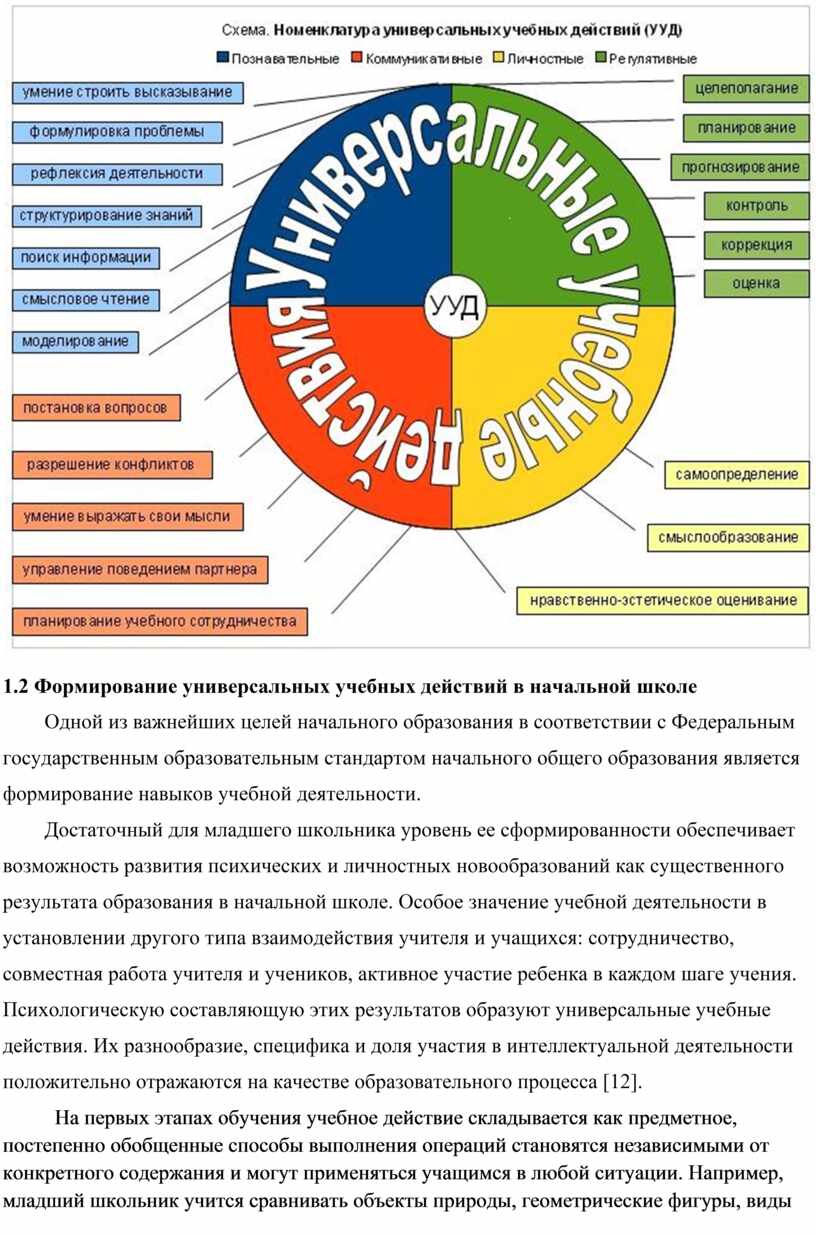Достаточный для младшего школьника уровень ее сформированности обеспечивает возможность развития психических и личностных новообразований как существенного результата образования в начальной школе. Особое значение учебной деятельности в установлении другого типа взаимодействия учителя и учащихся: сотрудничество, совместная работа учителя и учеников, активное участие ребенка в каждом шаге учения. Психологическую составляющую этих результатов образуют универсальные учебные действия. Их разнообразие, специфика и доля участия в интеллектуальной деятельности положительно отражаются на качестве образовательного процесса [12].