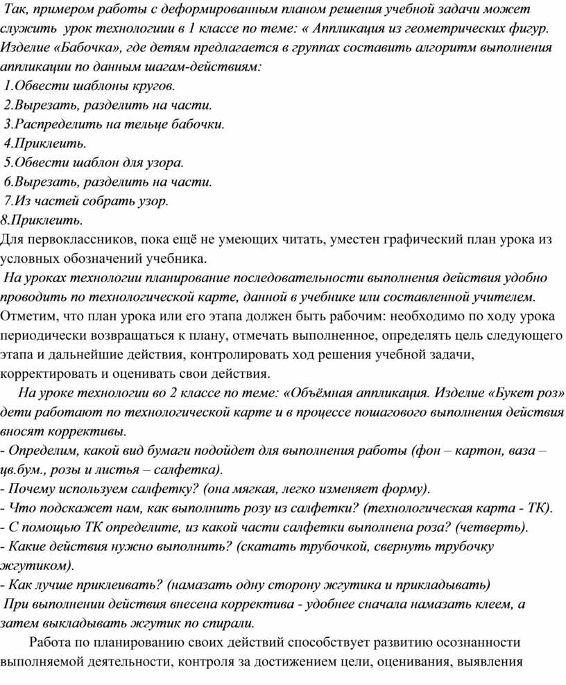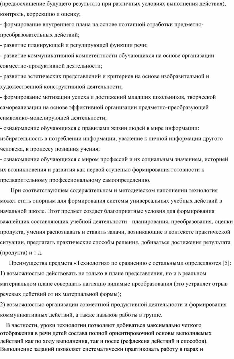 При соответствующем содержательном и методическом наполнении технология может стать опорным для формирования системы универсальных учебных действий в начальной школе. Этот предмет создает благоприятные условия для формирования важнейших составляющих учебной деятельности - планирования, преобразования, оценки продукта, умения распознавать и ставить задачи, возникающие в контексте практической ситуации, предлагать.