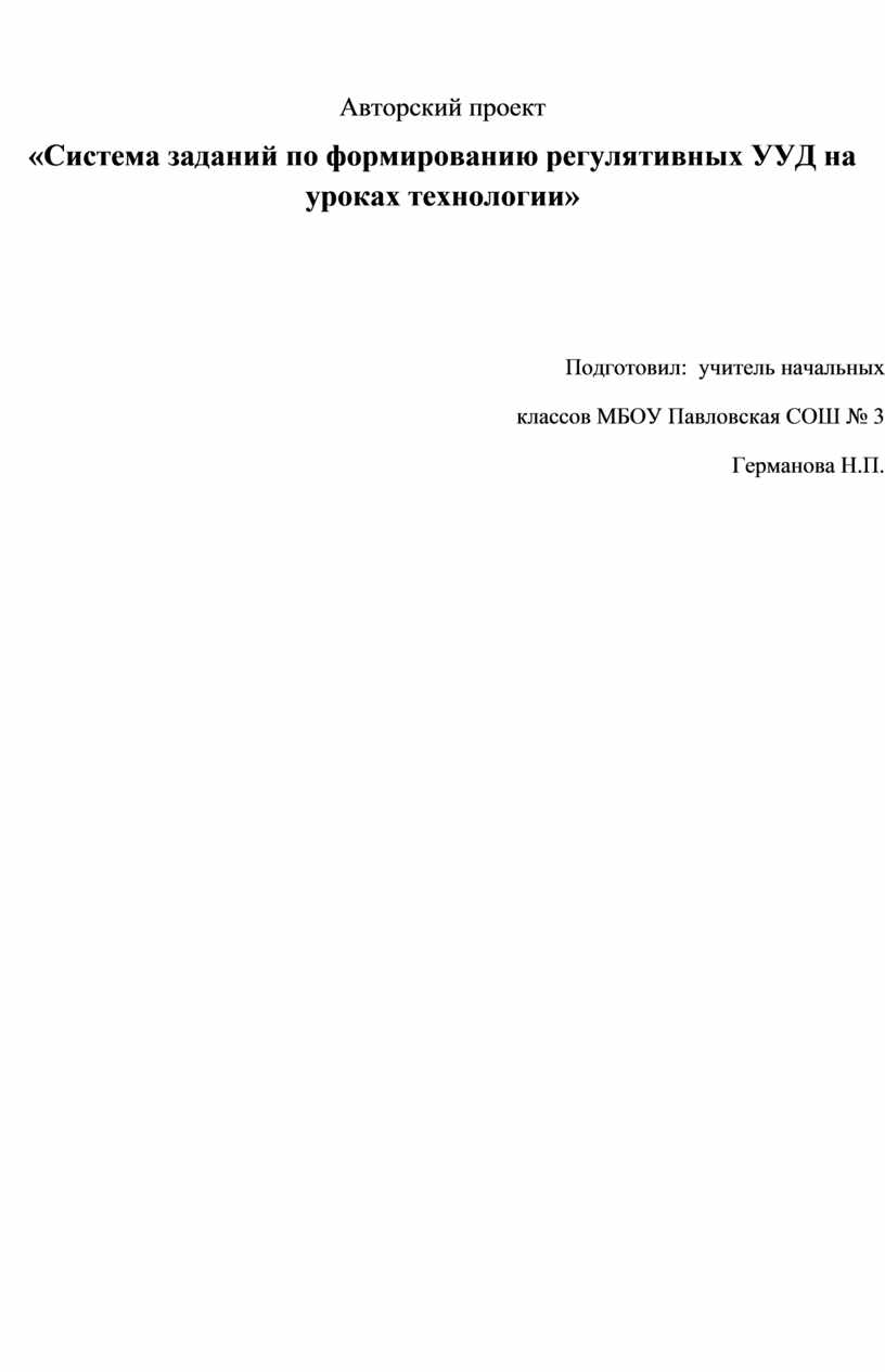Исходя из актуальности проблемы, была определена тема проекта «Система заданий по формированию регулятивных УУД на уроках технологии».