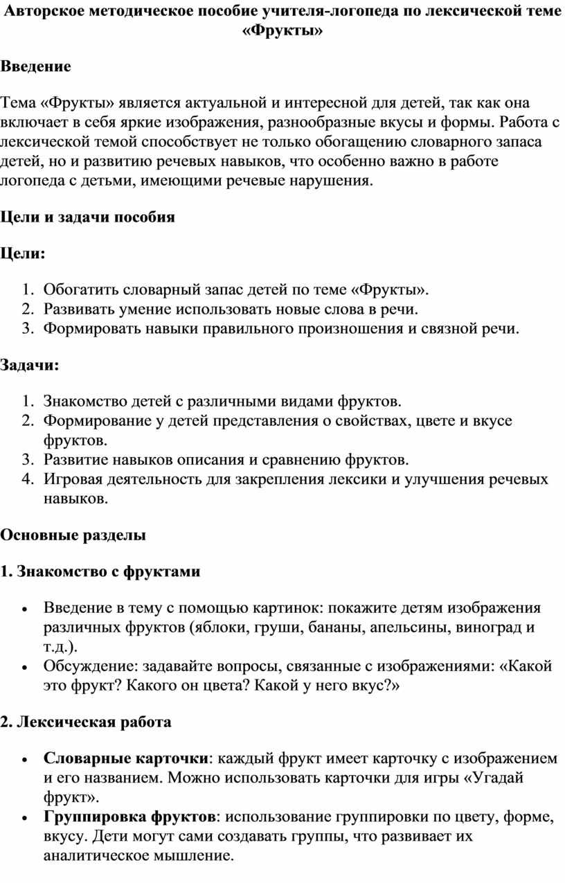 Авторское методическое пособие учителя-логопеда по лексической теме «Фрукты»
