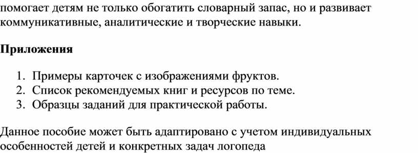 Изучение лексической темы «Фрукты» предоставляет богатые возможности для развития речевых навыков у детей. Работая с данной темой, логопед помогает детям не только обогатить словарный запас, но и развивает коммуникативные, аналитические и творческие навыки.