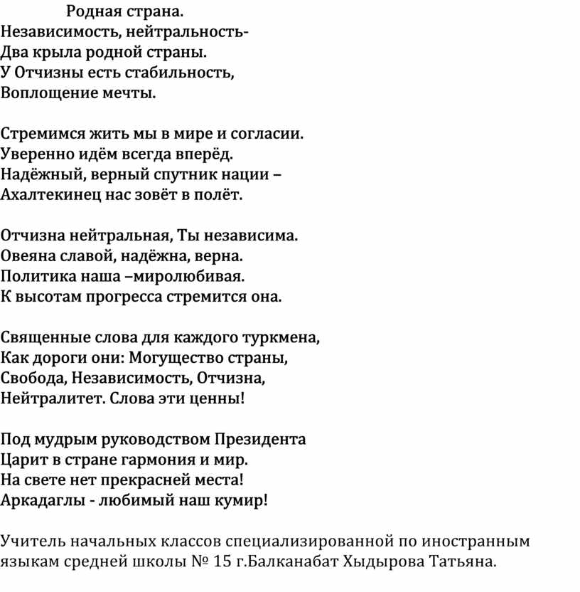 Учитель начальных классов специализированной по иностранным языкам средней школы № 15 г.Балканабат Хыдырова Татьяна.